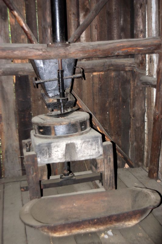 Wnętrze młyna z wiatrakiem: drewniany stojak z żarnami do mielenia śruty zbożowej z dozownikiem ziarna oraz z metalową ośką przenoszącą napęd z umieszczonych nad budynkiem metalowych śmigów napędzanych wiatrem.