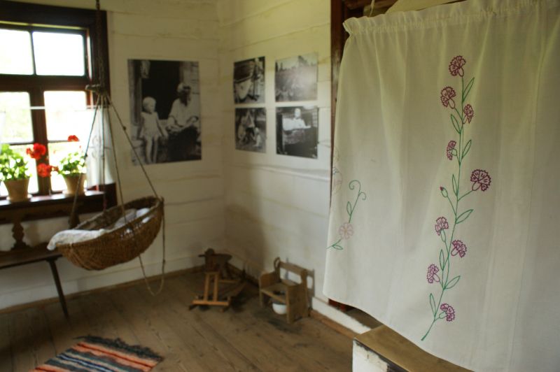Wystawa „Dziecięce troski i beztroski”. Sprzęty służące opiece nad najmłodszymi – drewniany nocnik, wiklinowa kołyska zawieszana pod sufitem, konik na biegunach.