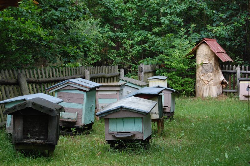 Drewniane ule na podwórku chałupy z Potrzebowa.