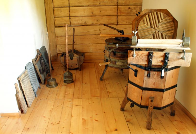 Chałupa ze wsi Krzyżewo, wewnątrz przedmioty codziennego użytku gospodarstwa domowego: dzwony do prania, tarki do prania, magiel, drewnianą pralkę.