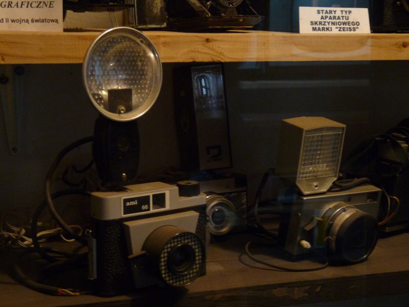 Aparaty fotograficzne z różnego typu lampami błyskowymi z okresu po II wojnie światowej. Pierwszy po lewej to wyprodukowane przez Polskie Zakłady Fotooptyczne aparat "Ami 66" typu box wyposażony w atrapę światłomierza selenowego wokół oprawy obiektywu w stylu op-art.