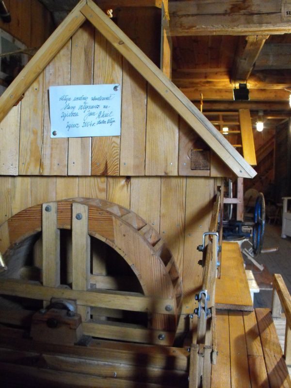 Ekspozycja w budynku młyna. Model młyna wodnego na Niebieskich Źródłach.