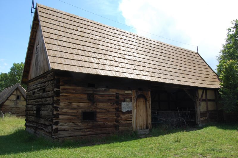 Przejazdowy spichlerz ze wsi Królów. Wjazd na podwórze prowadzi przez nieposiadającą wrót środkową część spichlerza. Budynek składa się z zamkniętego pomieszczenia o konstrukcji zrębowej i otwartej części, zbudowanej metodą konstrukcji słupowej, wypełnionej do połowy belkami, a powyżej strychulcem. Wewnątrz mieści się stała wystawa „Ptaki Ludwika Oleksego”. Dach dwuspadowy pokryty gontem.