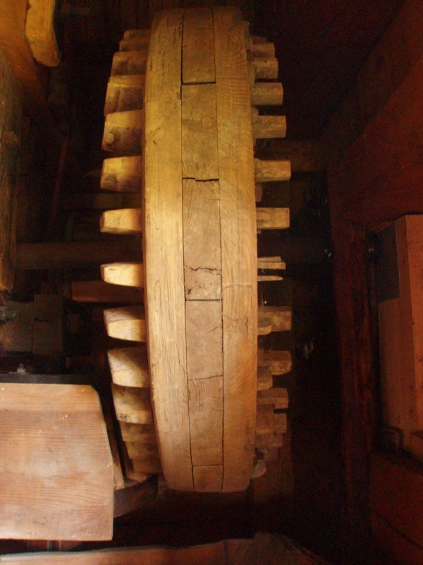Mechanizm wiatraka typu koźlak ze wsi Sława Sląska z 1603 roku. Precyzyjnie zbudowany system przekładni i kół pozwalał młynarzowi mielić do 2 ton zboża dziennie.