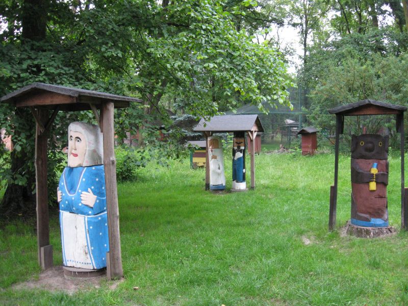 Ule figuralne na terenie parkowej pasieki. Ule rzeźbione w jednym kawałku drewna, polichromowane, osłonięte daszkami.