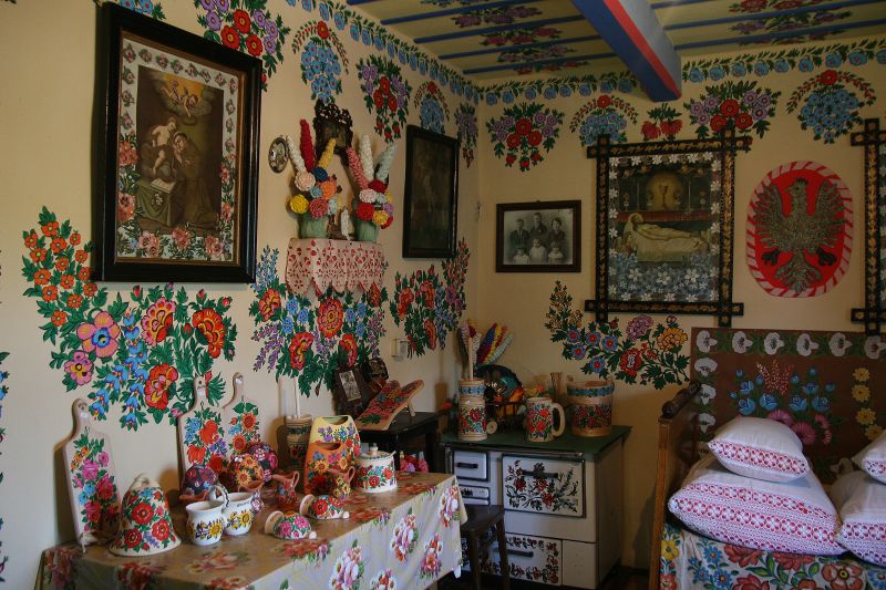 Biała izba w chałupie Felicji Curyłowej. Ściany i sufit bogato pokryte malowanymi wzorami kwiatowymi i ornamentem. Na ścianach oleodruki religijne przyozdobione malowanymi wycinankami kwiatowymi. Na stoliku pamiątki - malowane deski do chleba, dzwonki i ceramika z zalipiańskim wzornictwem.