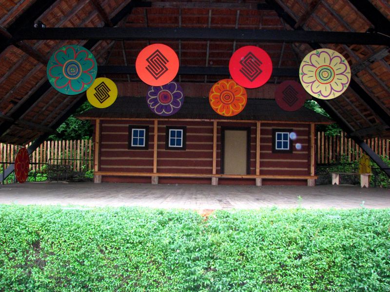 Zadaszona estrada o powierzchni 120m. kw. na placu przed wejściem na teren Parku Etnograficznego.