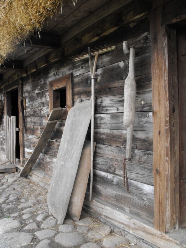Budynek inwentarski ze wsi Skoki Duże z roku 1890. U wejścia do budynku widać pionowo ustawione koryto do parzenia świń. Budynek posiada ciekawą powałę, wykonaną z drążków oplecionych powrósłami ze słomy.