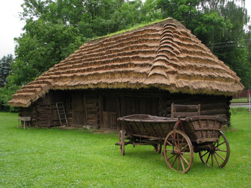 Drewniana obora ze wsi Stróżna. Budynek o konstrukcji zrębowej z węgłami łączonymi "na obłap". Dach czterospadowy kryty słomą układną schodkowo. Przed budynkiem wóz drabiniasty z wypełnieniem z wikliny.
