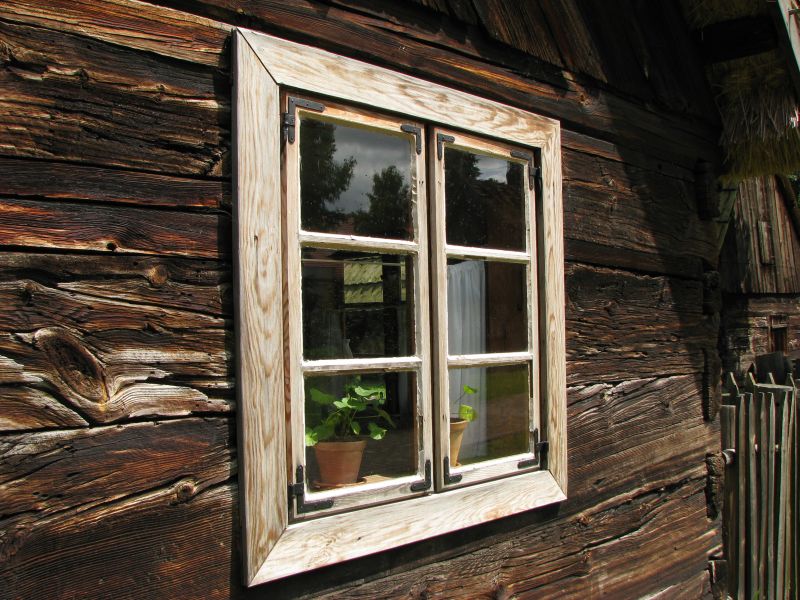 Okno chałupy e wsi Sucha z I połowy XIX wieku. Okno drewniane, dwuskrzydłowe z kowalskimi okuciami. Chałupa o konstrukcji zrębowej z łączeniami węgłów na "rybi ogon" bez ostatków.
