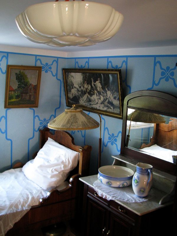 Zagroda Albrechta w Swołowie - wnętrze domu. Na zdjęciu wnętrze sypialni - łóżko, toaletka, żyrandol i obraz ścienne. Ściany zdobione wzorem z szablonu.