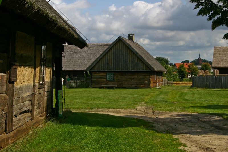 Widok na skansen ze ścieżki prowadzącej na cmentarz. Po lewej stronie widoczna XVIII-wieczna karczma ze wsi Sokołowo Budzyńskie koło Chodzieży. Karczma o konstrukcji szachulcowej mieszanej z sumikowo-łątkową. Na wprost chałupa ze wsi Pakosław z 1834 roku.
