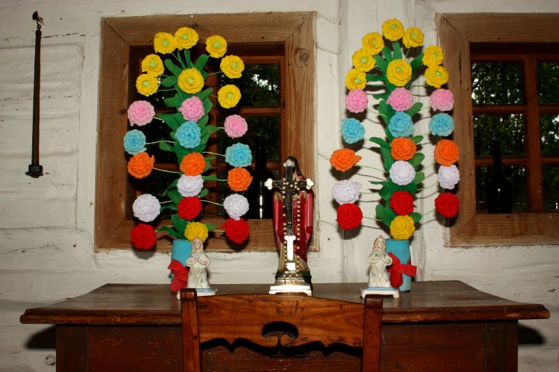 Kompozycje z bibułowych kwiatów na stole w chałupie zamożnego gospodarza ze wsi Rokitno z 1805 roku.