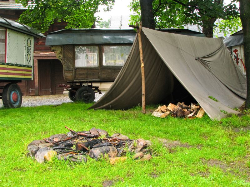 Widok ogólny na ekspozycję wozów cygańskich i obozwiska na terenie Muzeum Etnograficznego w Tarnowie. Wozy były nie tylko środkiem transportu Romów, ale i mieszkaniem. Dlatego prócz obudowy mają również zadaszenie. Drewniane obudowy wozów są bogato zdobione kolorową ornamentyką, lusterkami i rzeźbionymi figurami smoków. Wozy z metalowymi dyszlami i kołami samochodowymi.