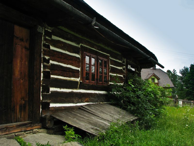Ściana frontowa chałupy babiogórskiej - Słopiakowej i zejście do piwniczki mieszczącej się pod budynkiem. Chałupa szerokofrontowa o konstrukcji zrębowej z węgłami łączonymi na "obłap" bez ostatków. Wypełnienie zrębu pobielone. Fundament z kamienia.