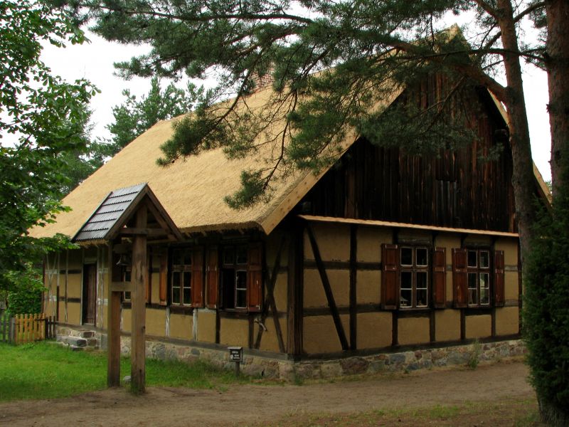 Szkoła z Więckowych wybudowana w latach 50-tych XIX wieku. Na zdjęciu wyraźnie widoczna szkieletowa konstrukcja ścian, kamienna podmurówka oraz dwuspadowy dach kryty słomą.