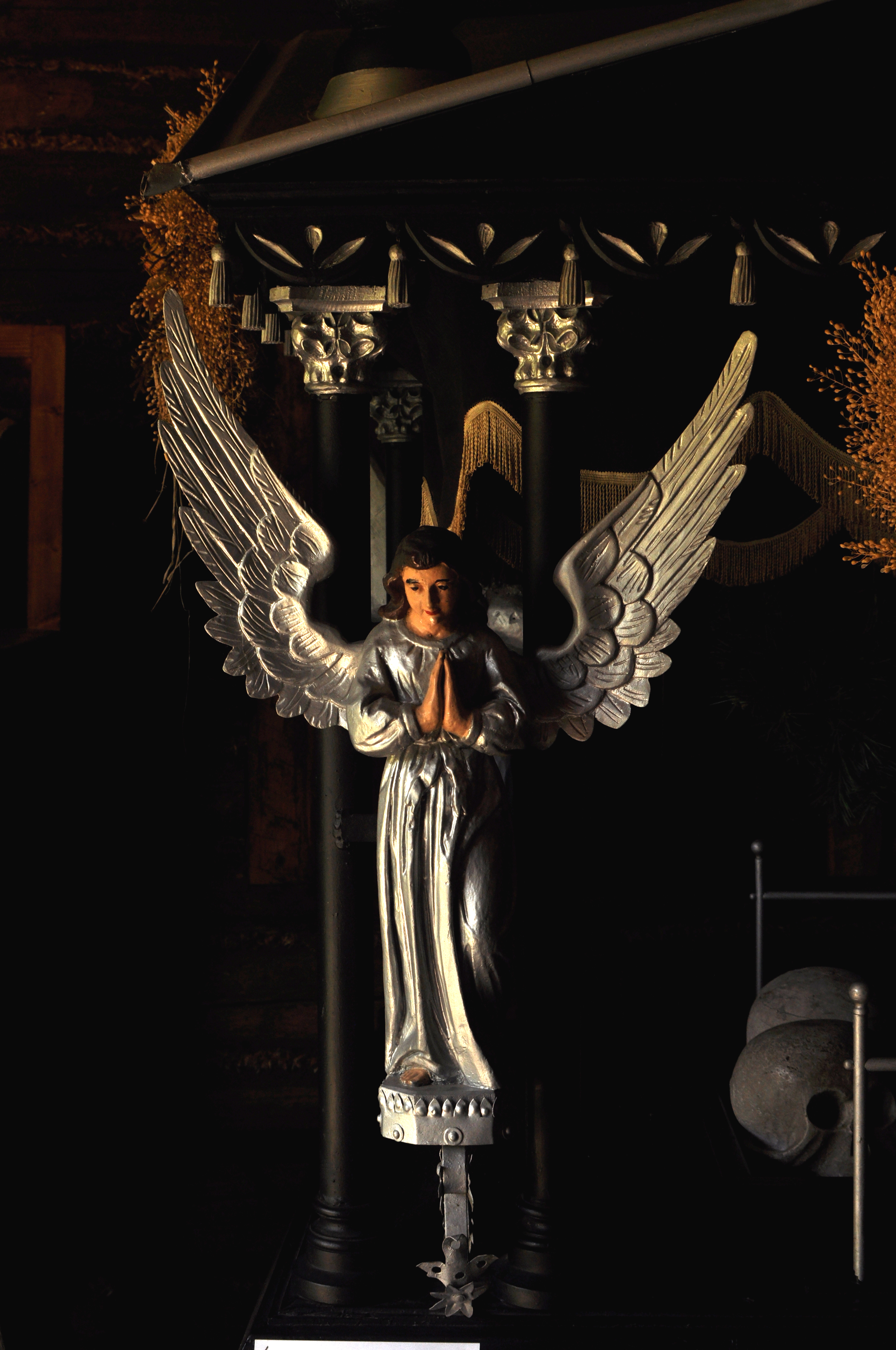 Drewniana figura anioła, element dekoracyjny karawanu pogrzebowego ze wsi Bęczarka z XIX wieku - ekspozycja muzealna w domu pogrzebowym.