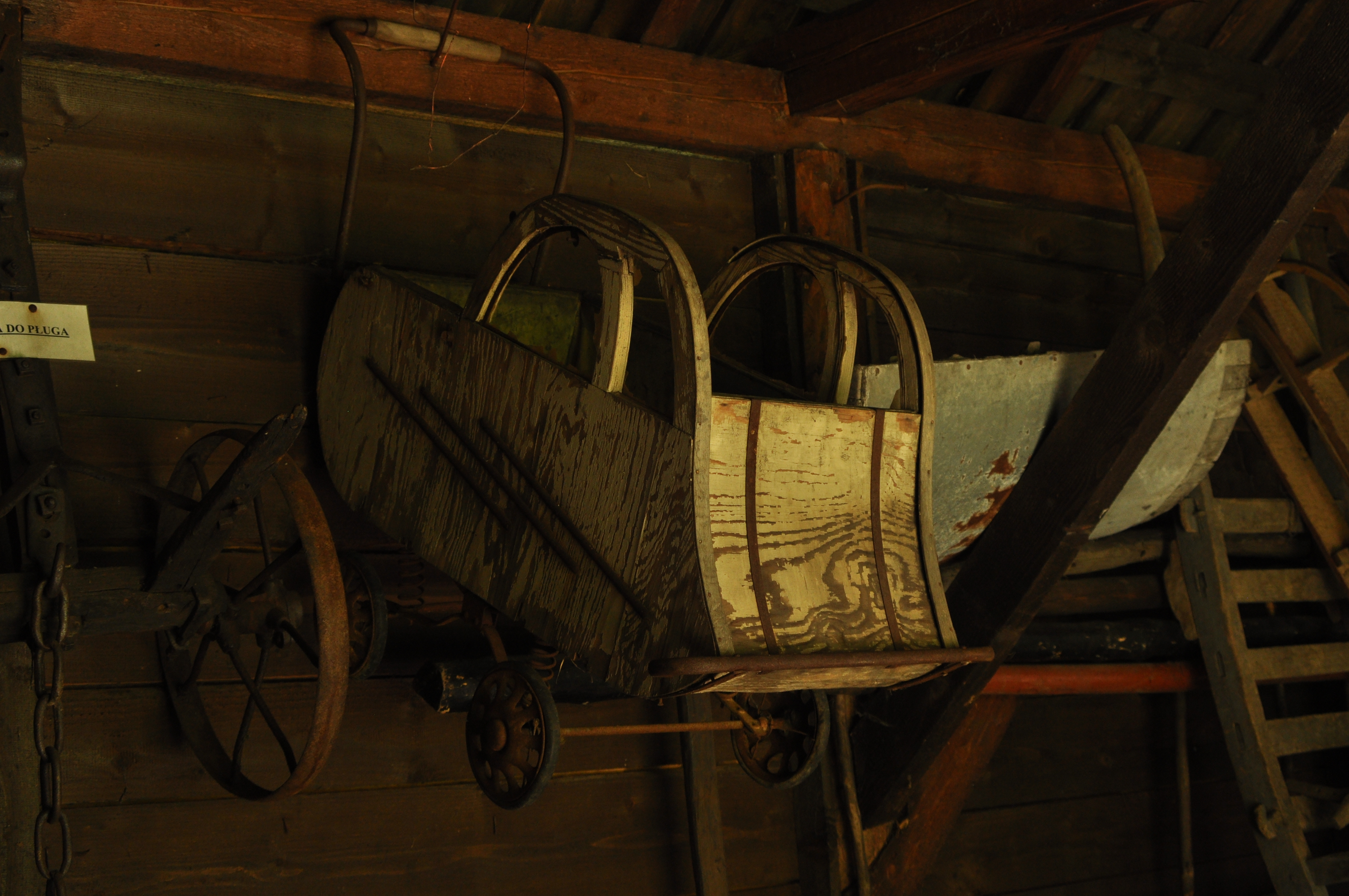 Drewniany wózek dziecięcy z okresu dwudziestolecia międzywojennego.