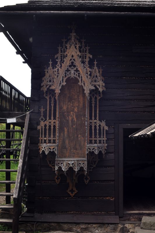 Wejście do kurnika ze wsi Brzezowa z 1890 roku. Budynek o konstrukcji zrębowej z węgłami łączonymi na "obłap". Na ścianie wisi drewniany, gotycki ołtarz.