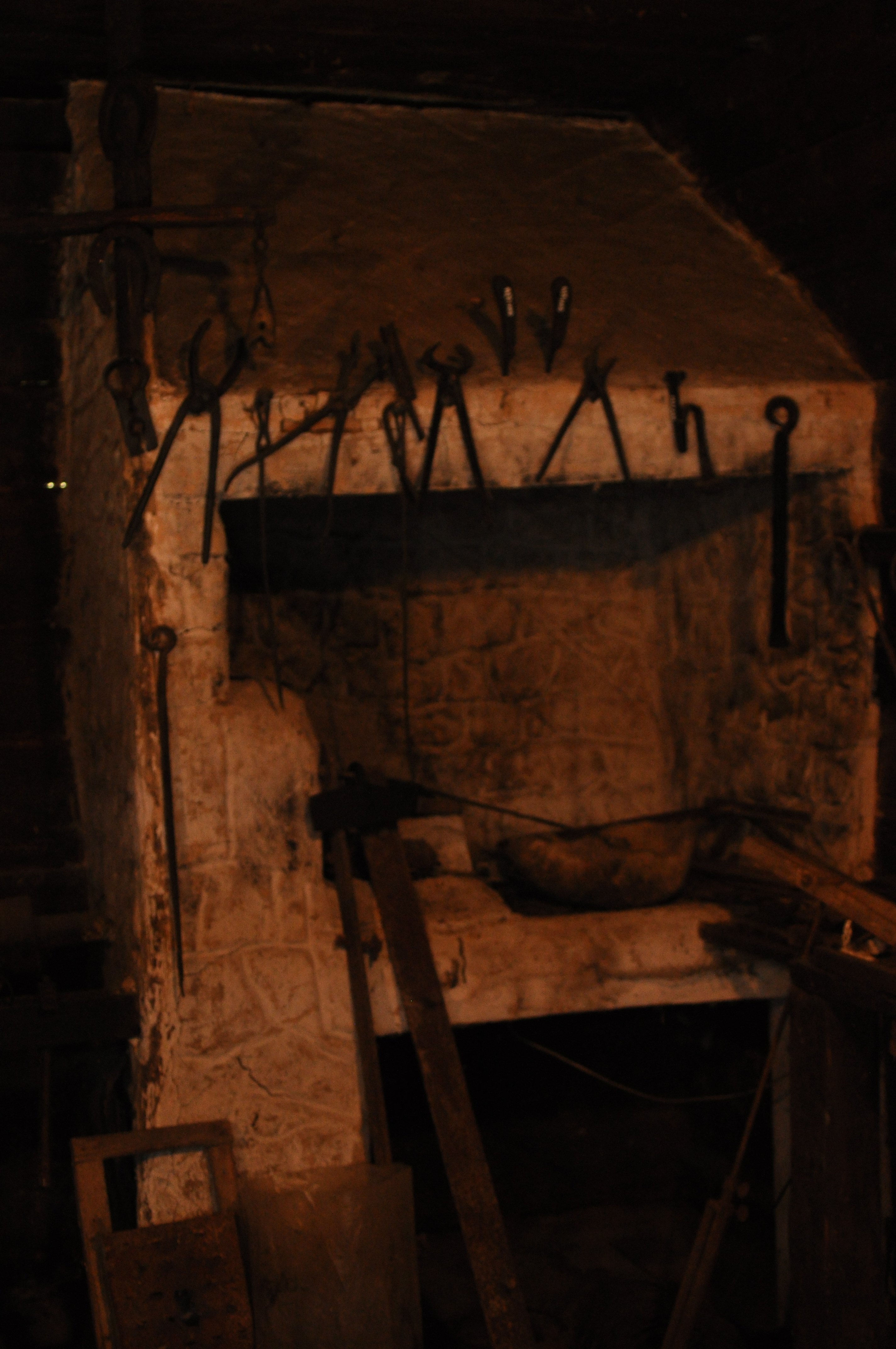 Piec kowalski wewnątrz kuźni ze wsi Zagórzany z 1863 roku. Na piecu narzędzia kowalskie: młot, kleszcze i cęgi.