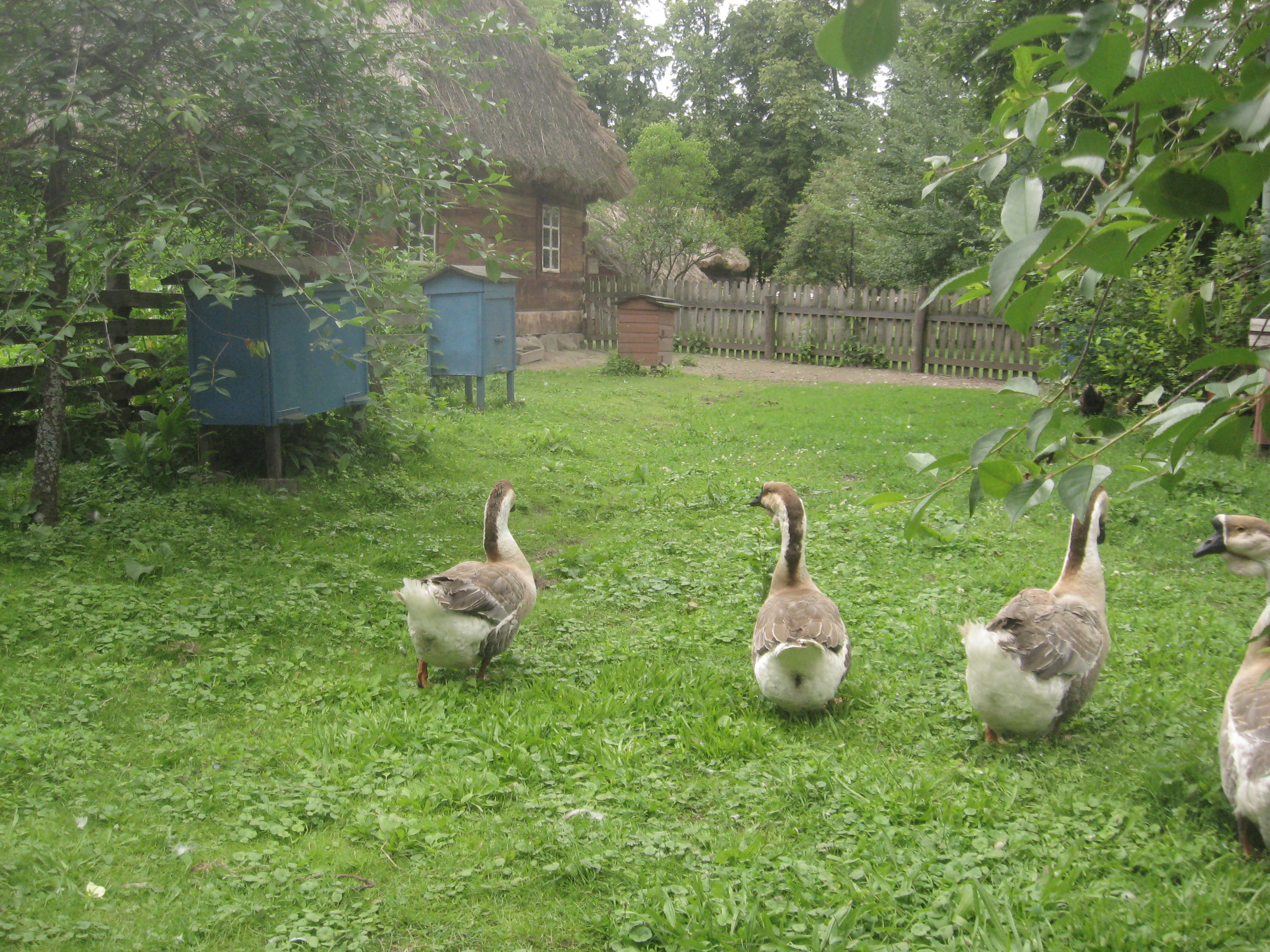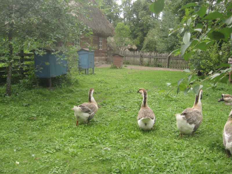 Zwierzęta na terenie skansenu są fragmentem ekspozycji. Tu spacerujące gęsi przy domu zamożnego chłopstwa.