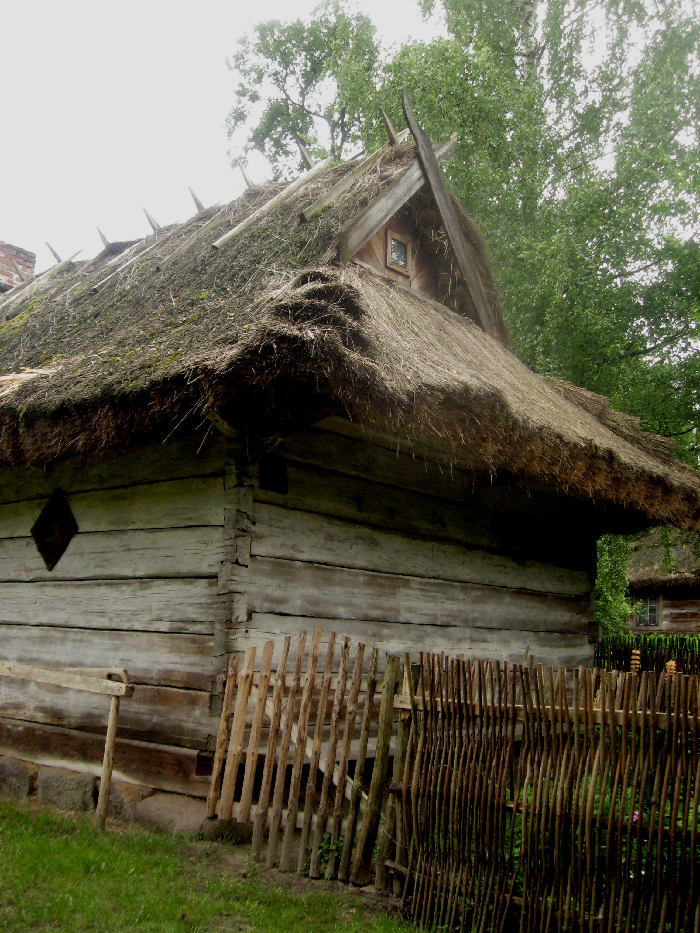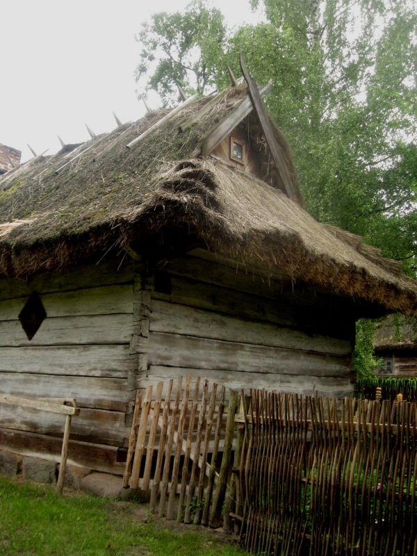 Chałupa wschodniopodlaska/ białoruska ze wsi Saki z końca XIX wieku. Budynek o konstrukcji węgłowej z łączeniem naroży na "rybi ogon". Dach przyczółkowy kryty słomą przykrytą kozłami.