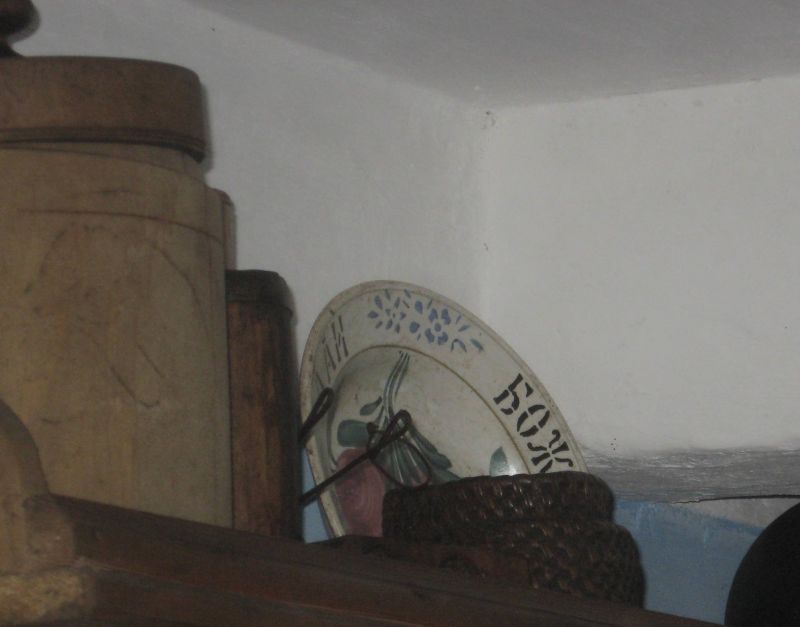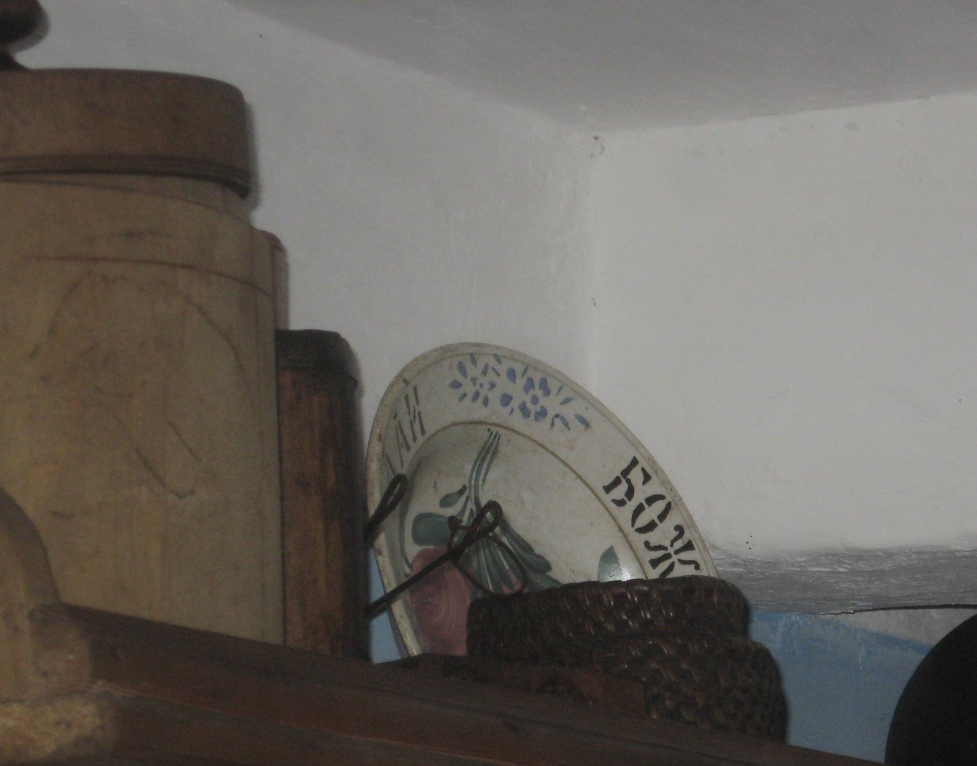 Wnętrze chałupy białoruskiej ze wsi Saki. Na zdjęciu talerz z napisem w cyrylicy.