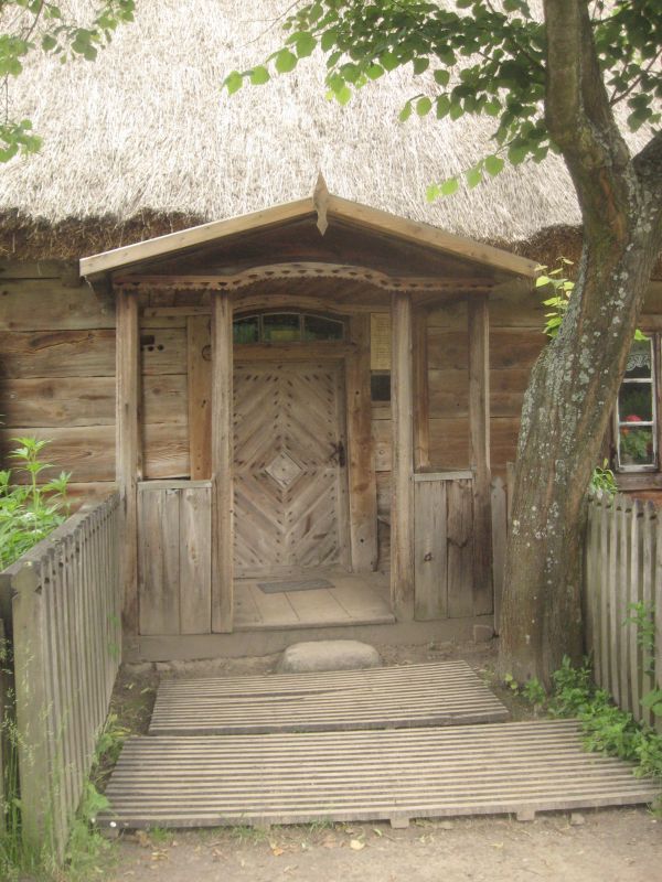 Elementem wyróżniającym chatę drobnoszlachecką był zdobny ganek, najczęściej o konstrukcji drewnianej, tutaj kryty drewnem. Na zdjęciu widoczne również zdobione drzwi. Fragment chałupy drobnoszlacheckiej ze wsi Zaręby.