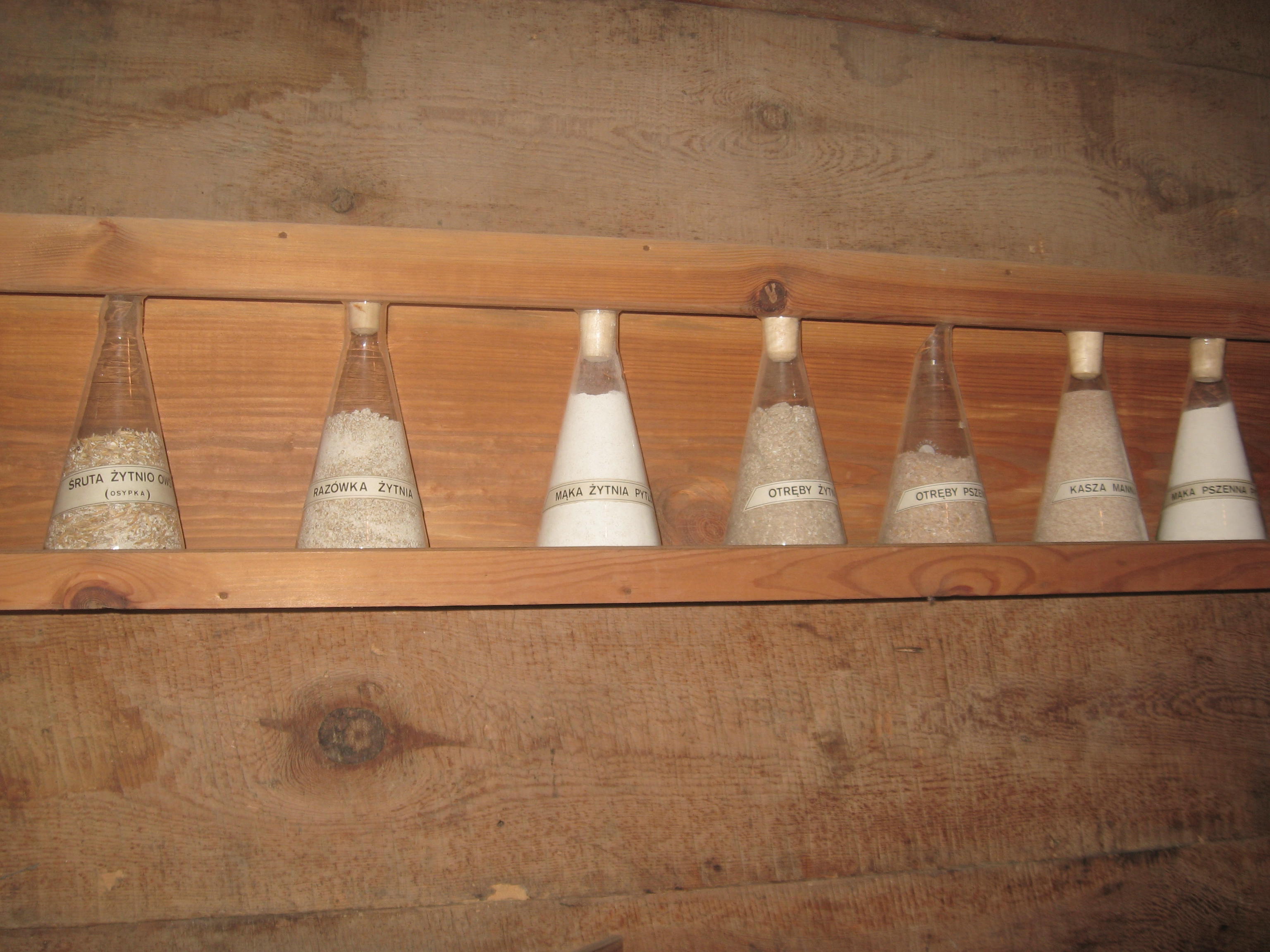 Wyeksponowane różnego rodzaju mąki, otręby, śrudy czyli jednym słowem – efekt pracy młyna.
