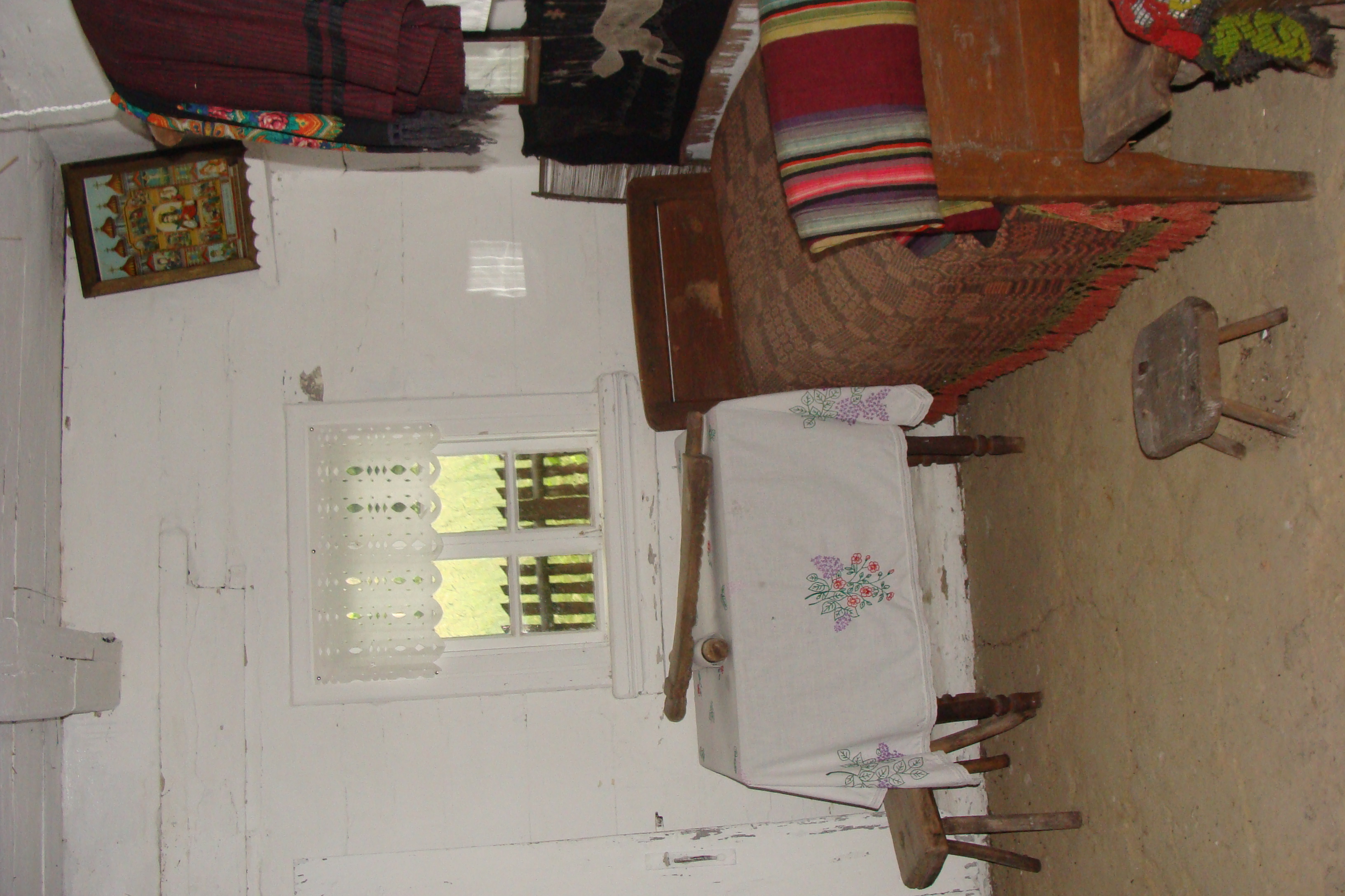Wnętrze chałupy ze wsi Wyryki z 1913 roku. Mała izba. Na stole najpewniej kijanka – decha do prania bielizny. W oknie wycinanka z papieru służąca za firankę. Podłoga z polepy glinianej.