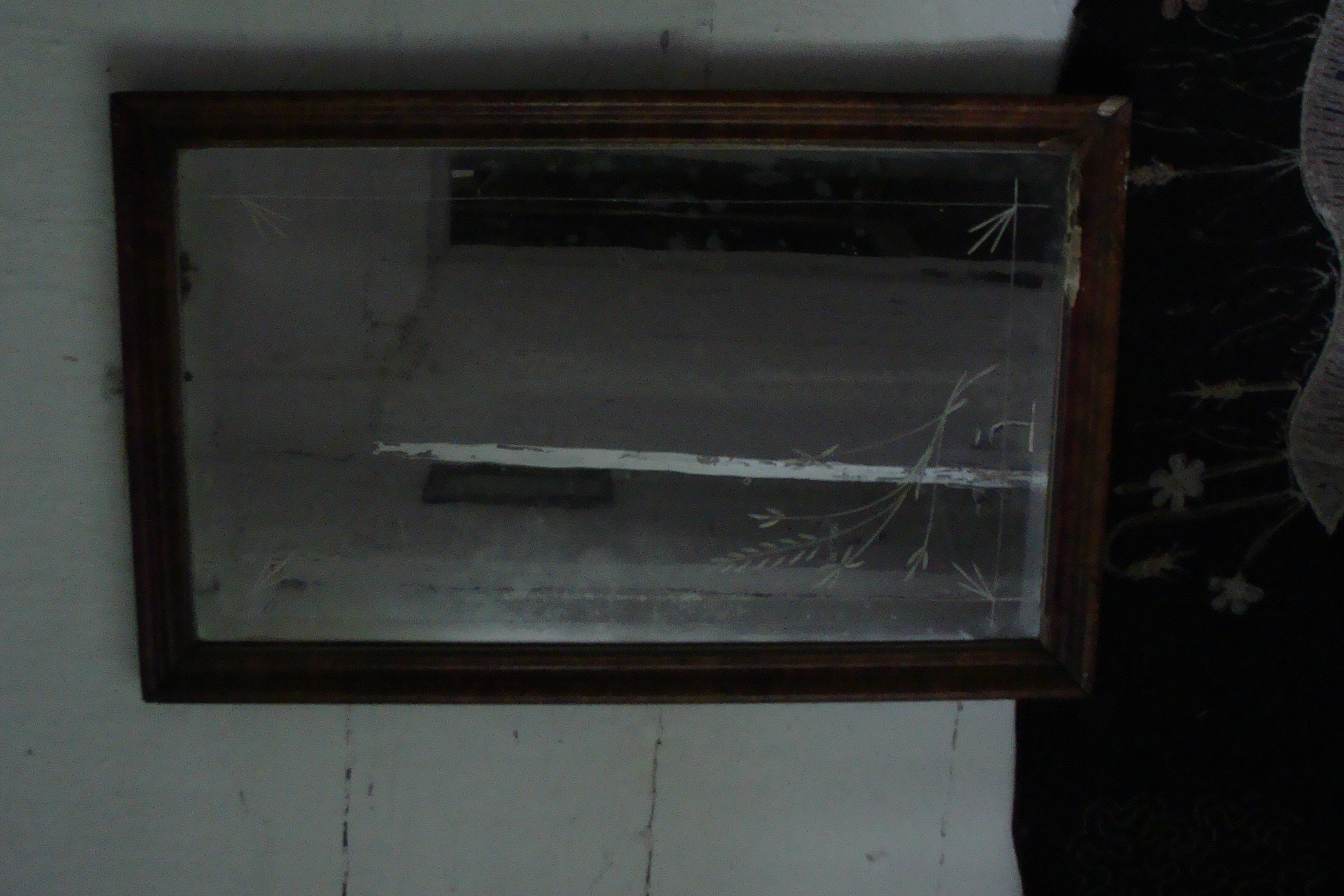 Lustro z motywami florystycznymi na tafli nad łóżkiem w małej izbie. W odbiciu drzwi do dużej izby.