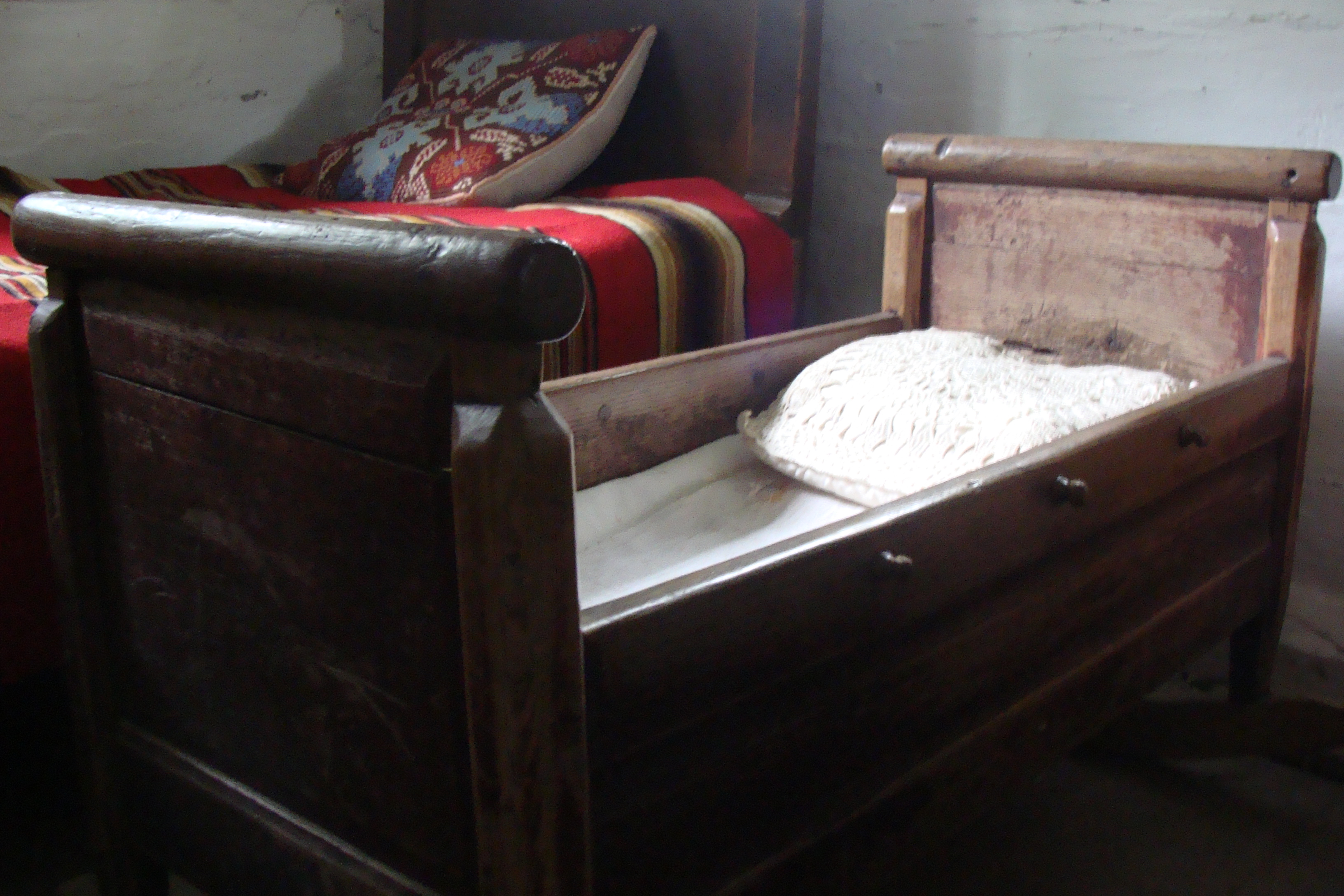 Drewniana kołyska w dużej izbie.