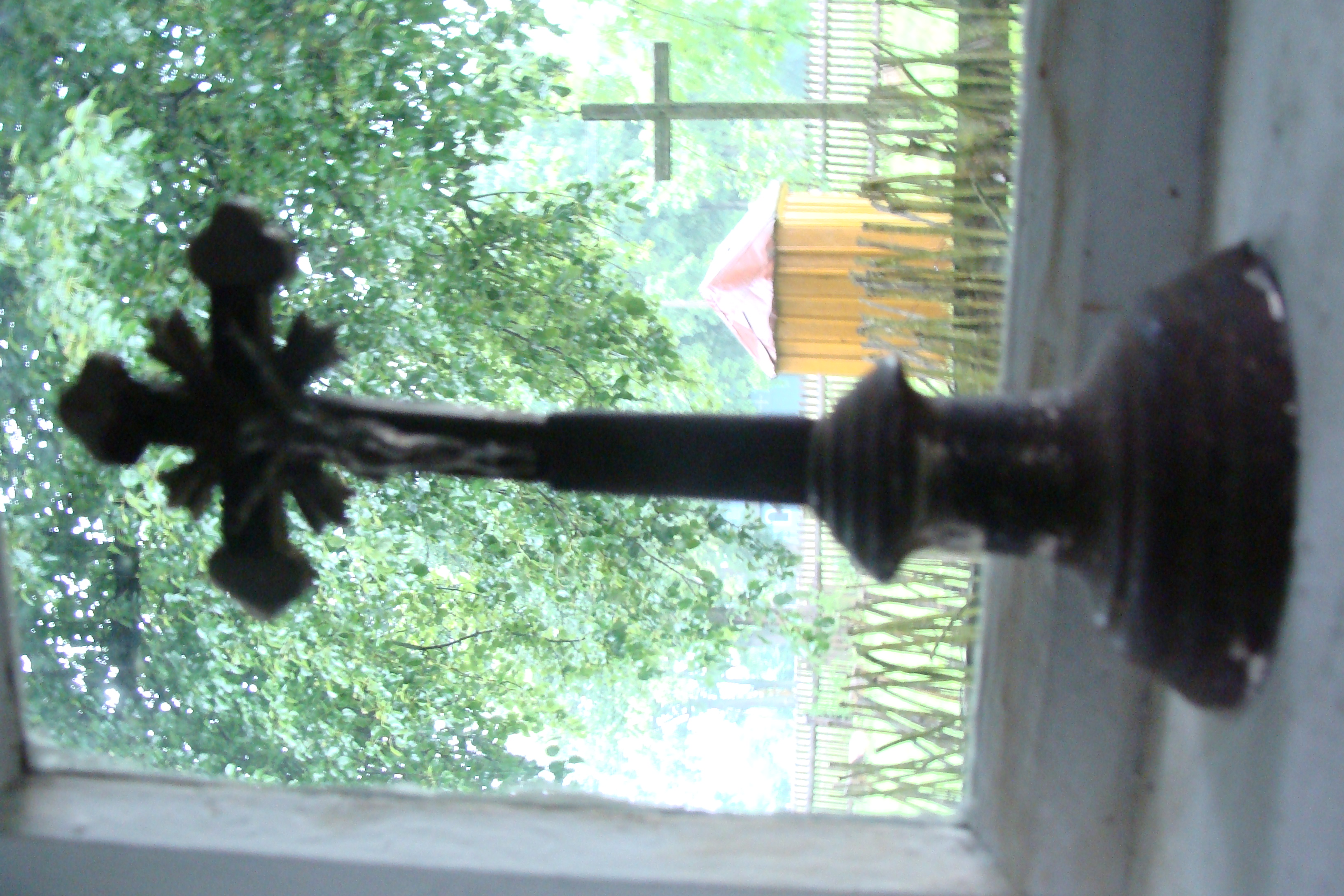Krucyfiks w oknie dużej izby, w tle stojąca w zagrodzie kapliczka.