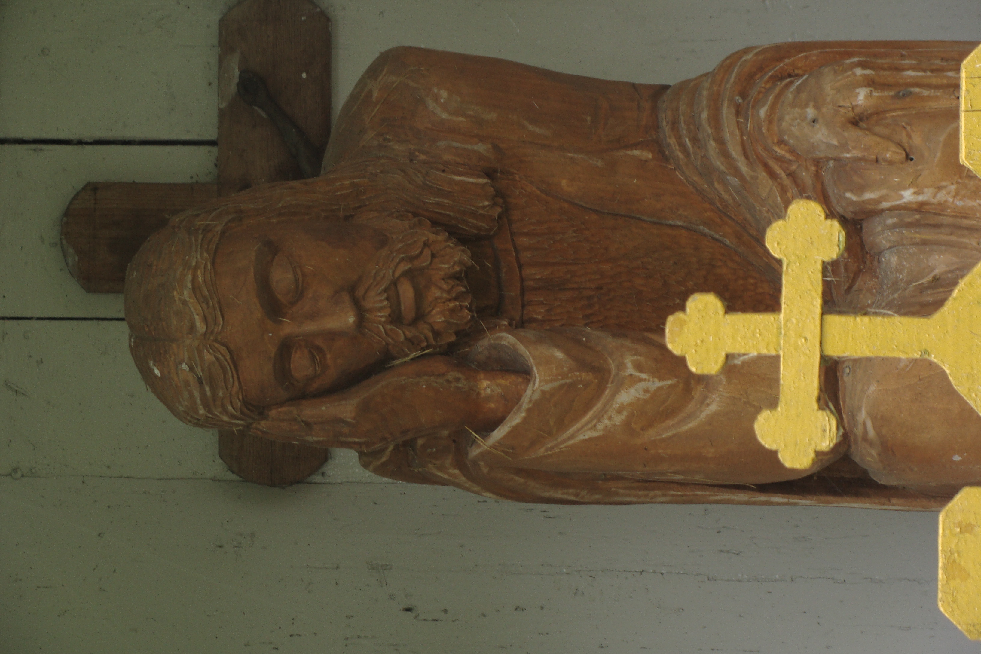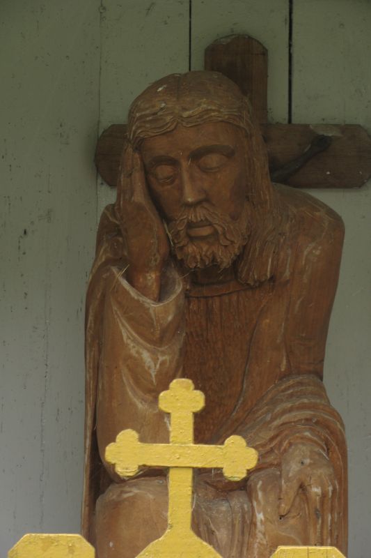 Chrystus Frasobliwy w kapliczce domkowej. Rzeźba drewniana,
