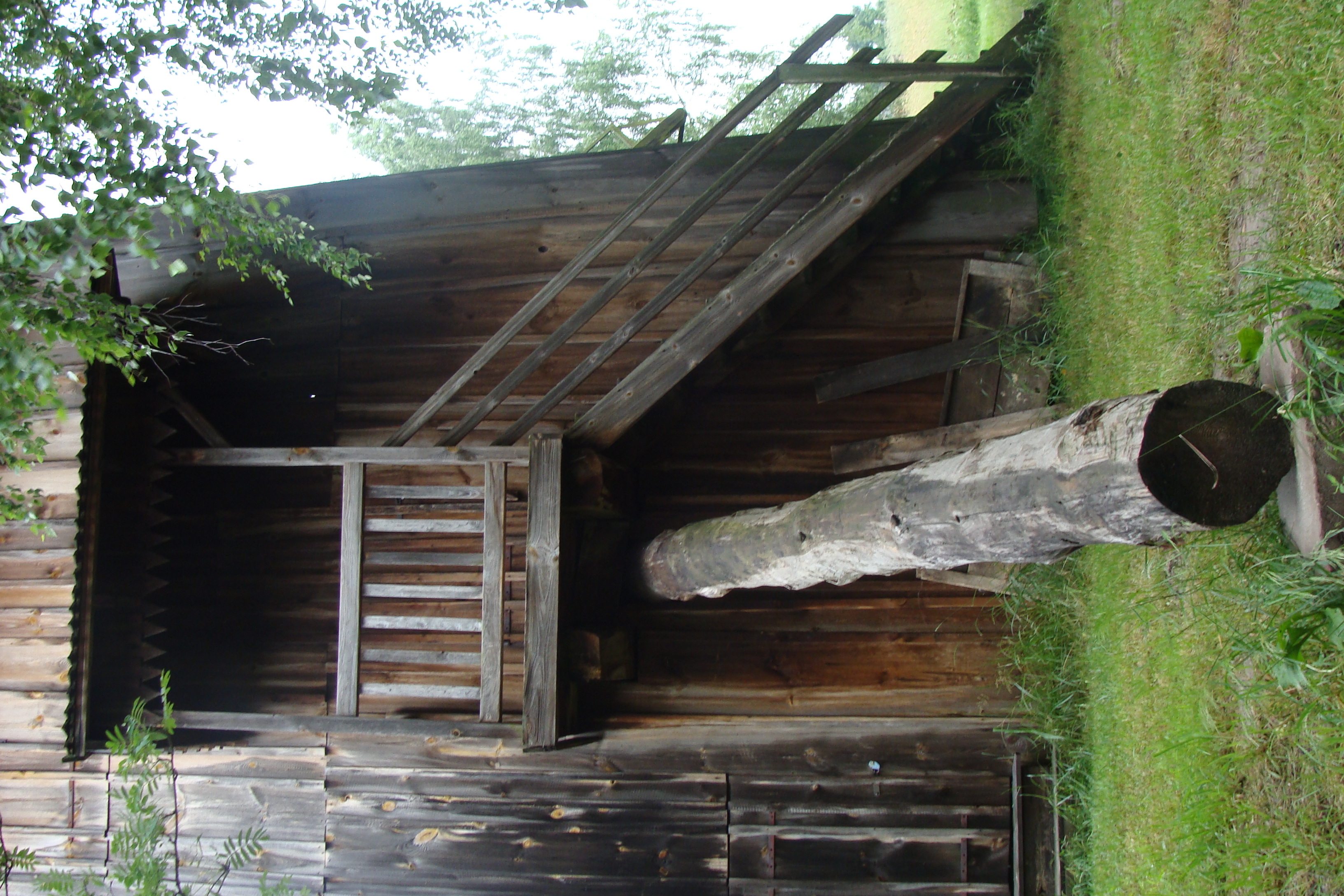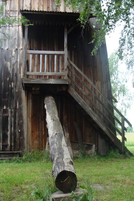 Wejście do wiatraka, na pierwszym planie słup służący do zmiany pozycji wiatraka. Budynek o konstrukcji słupowo-ryglowej.