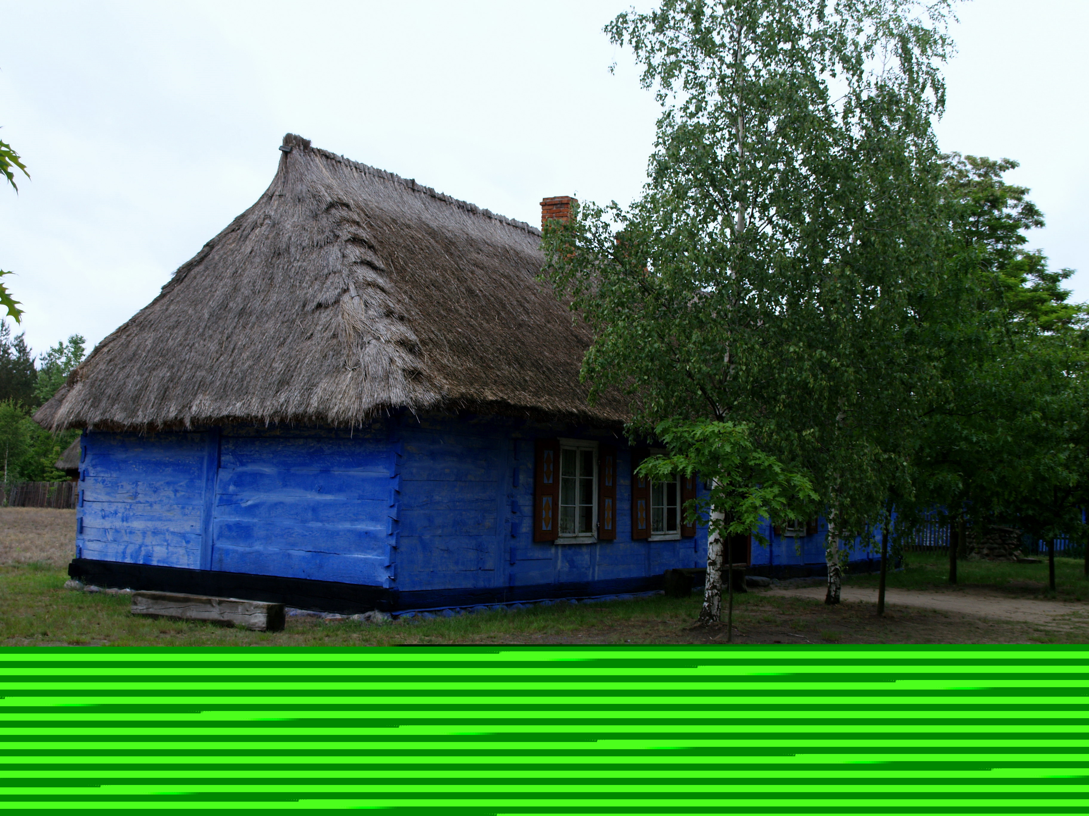 Chałupa ze wsi Chlebów z końca XIX wieku. Budynek szerokofrontowy o konstrukcji zrębowej mieszanej z sumikowo – łątkową. Ściany od zewnątrz malowane na niebiesko. Dach czterospadowy o konstrukcji krokwiowej.
