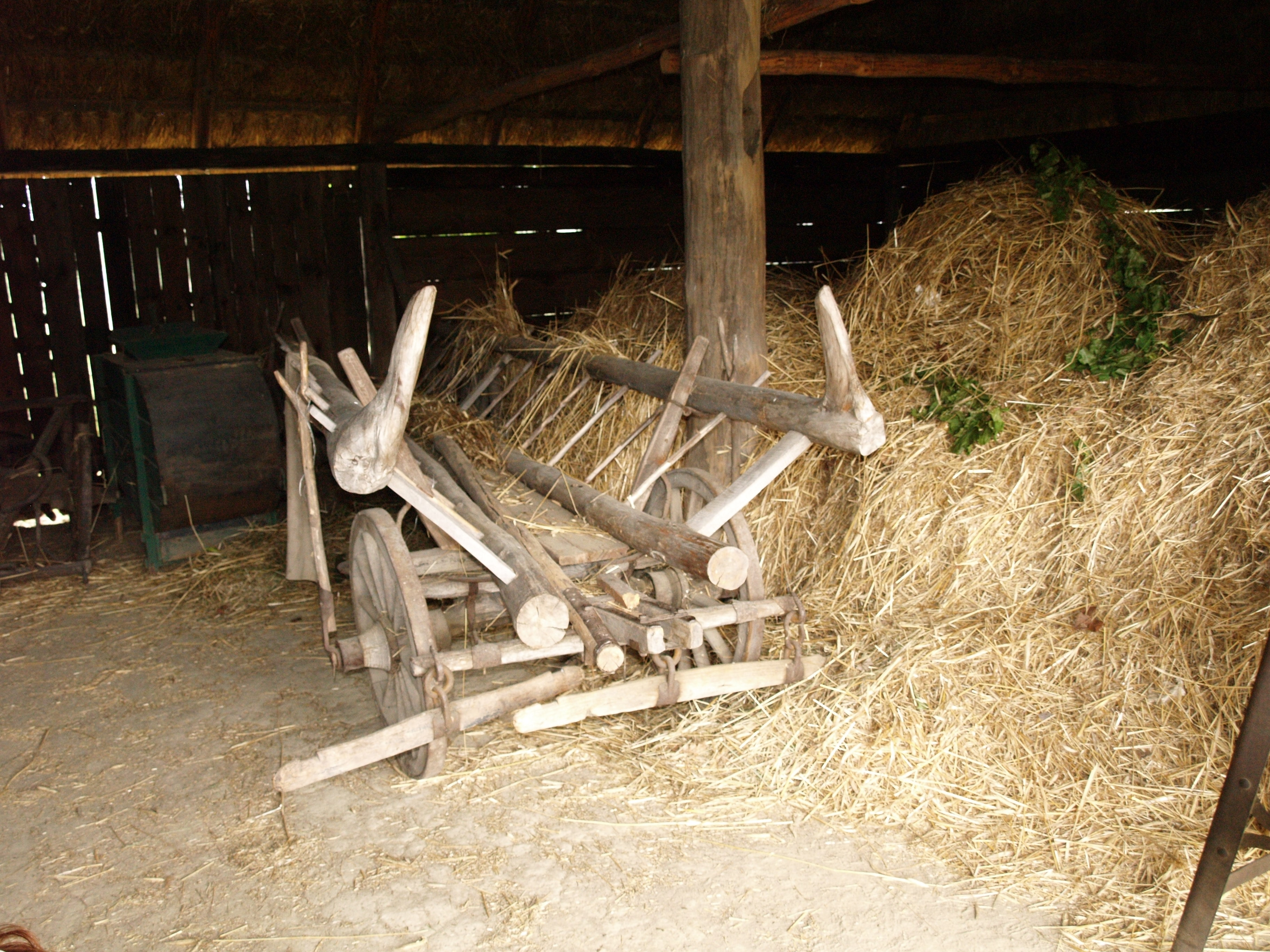 Wóz drabiniasty prezentowany we wnętrzu stodoły. Koła drewniane obite blachą.