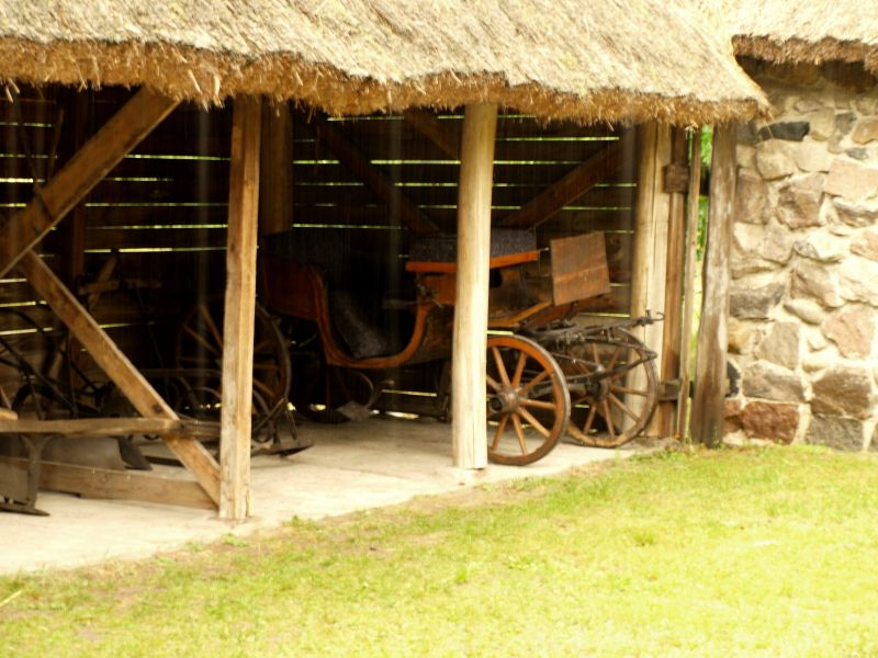 Otwarty brog – fragment zamkniętej zagrody typu „okólnik”. Pod dachem widać drewnianą bryczkę i pług.