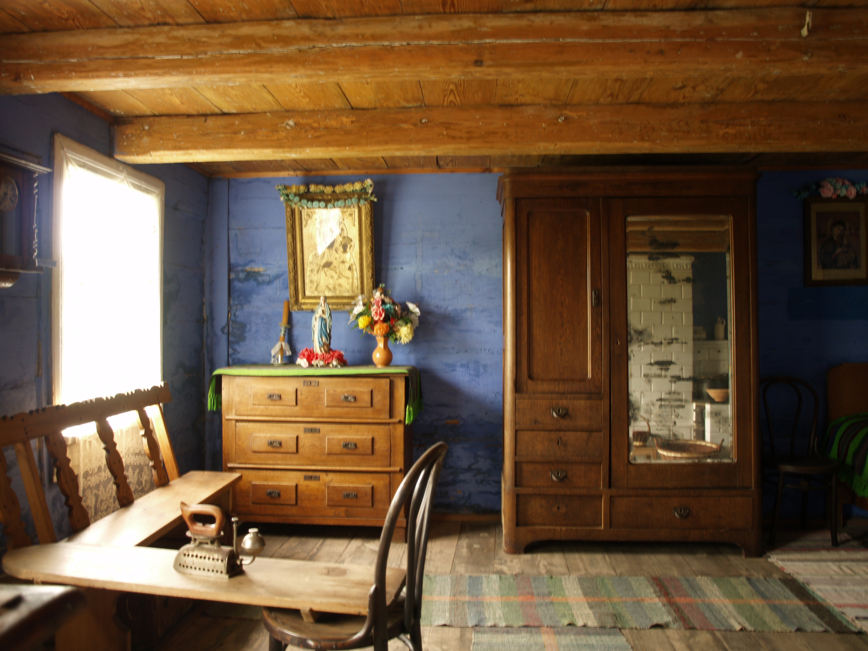 Izba z wyposażeniem z okresu międzywojennego. Meble wykonane przez stolarzy miejskich.