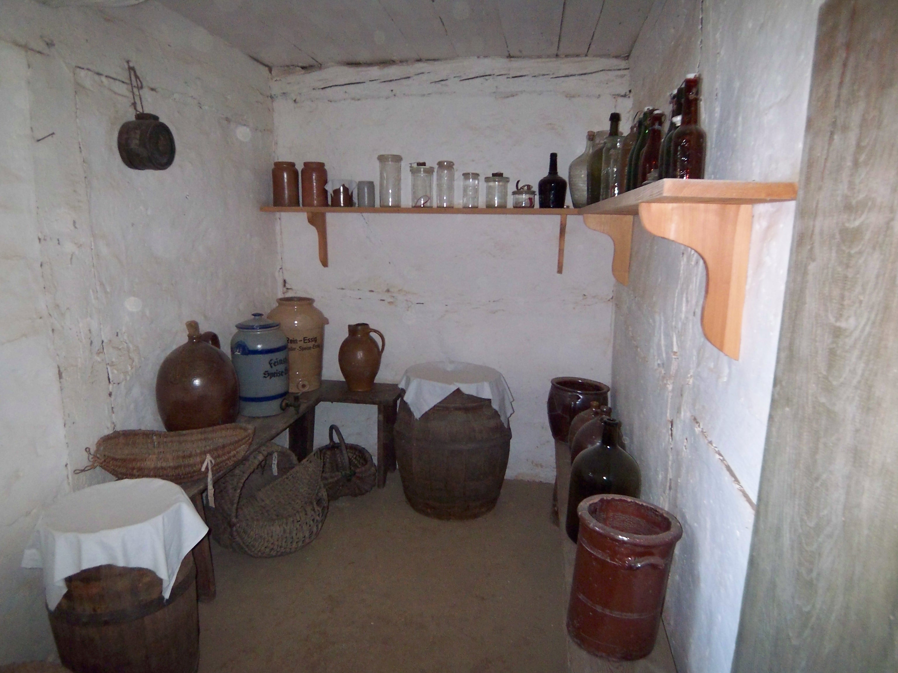 Kuchnia pomorska z wyposażeniem pochodzącym z XIX i pierwszej połowy XX wieku. Naczynia gliniane, kamionkowe i drewniane. Klepkowe cebry, konwie i balie służyły do przechowywania wody i mięsa, mycia naczyń i zlewania pomyj. W kamionkowych garncach przechowywano nabiał i tłuszcz oraz przetwory na zimę. Do butelek po piwie zlewano sok z wiśni oraz domowe wino z porzeczek lub winogron. |