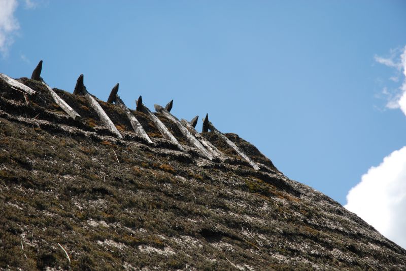 Dach Chałupy Szylarów z XVIII/XIX wieku. Kalenica dachu czterospadowego, krytego słomą i zabezpieczonego przed wiatrem drewnianymi kozłami.