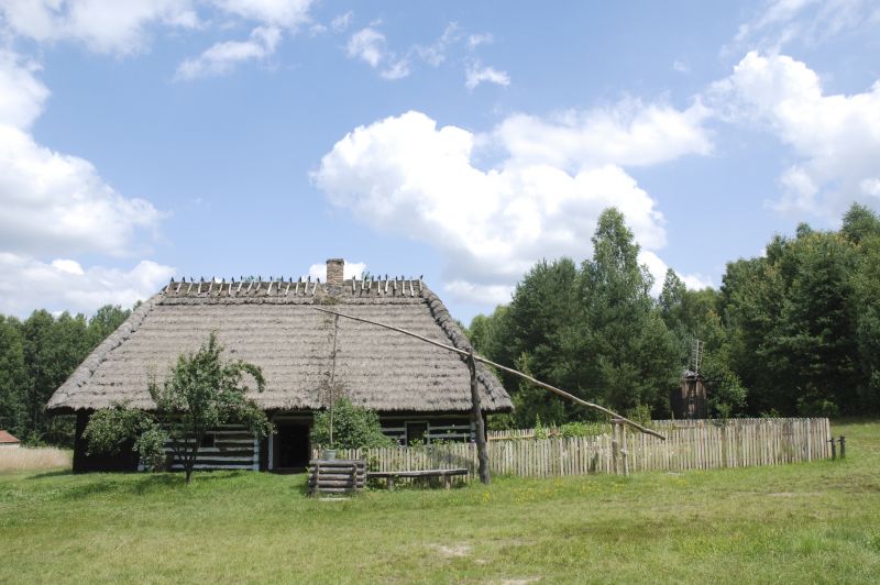 Rzeszowska zagroda Kielarów ze wsi Markowa. Najstarszy budynek w muzeum - chałupa z 1804 roku (data „17 Augustus 1804” wypisana na belce nadproża). Chałupa przysłupowa, ze ścianami zrębowymi łączonymi w węgłach na "rybi ogon". Dach czterospadowy pokryty w schodki słomą. Przed chałupą zrębowa studnia z żurawiem. |