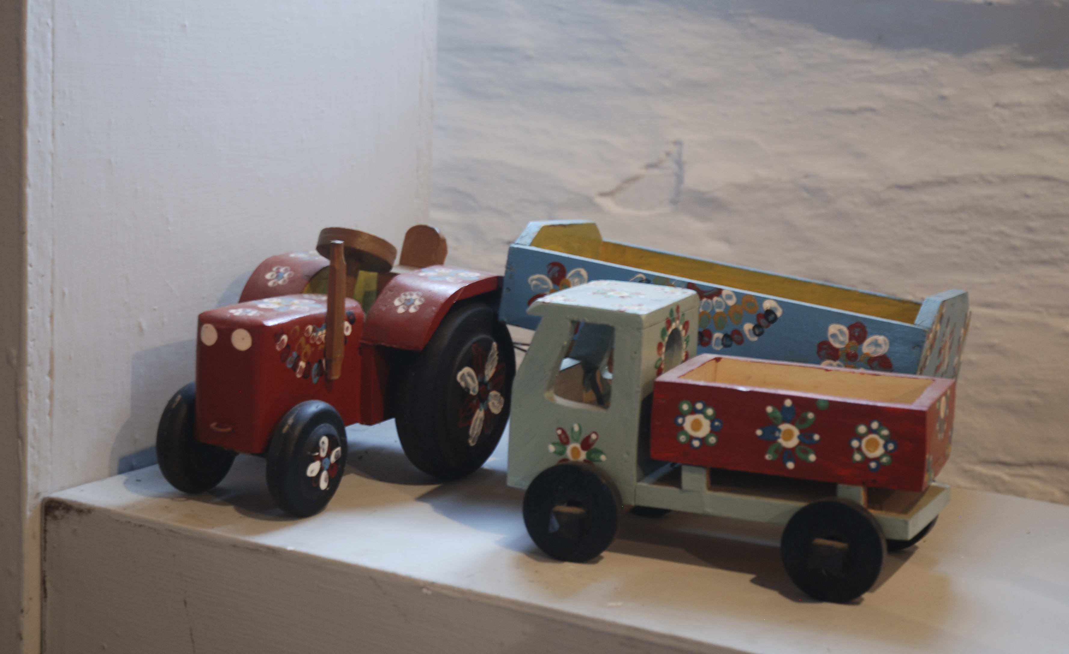 Wystawa zabawek w lasowiackiej chałupie ze wsi Wrzawy. Zabawki – traktor i ciężarówka.