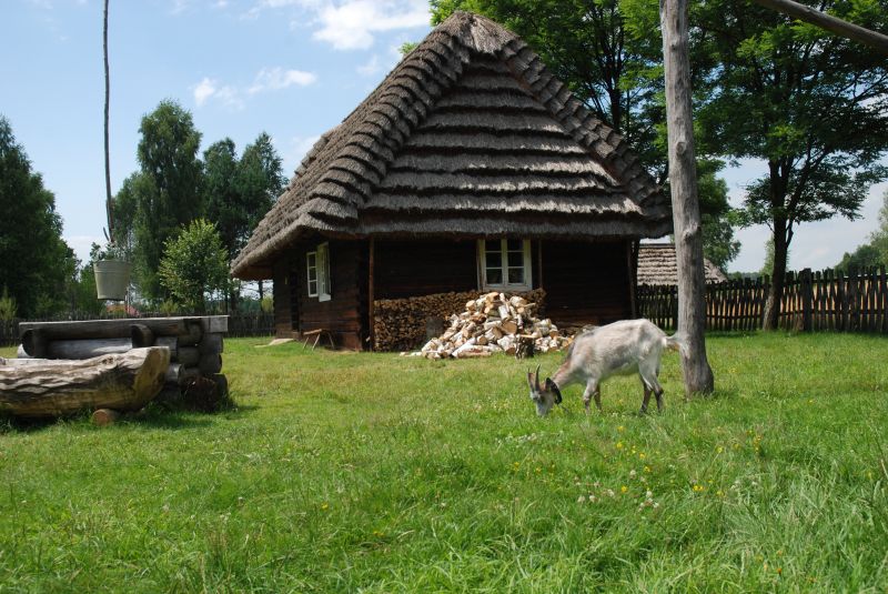 Lasowiacka chałupa ze wsi Jeziórko z XIX wieku. Ściany chałupy z bali drewnianych w konstrukcji zrębowej. Dach czterospadowy, poszywany schodkowo słomą. Zagroda otoczona płotem z dartych desek. Na pierwszym planie studnia z żurawiem.