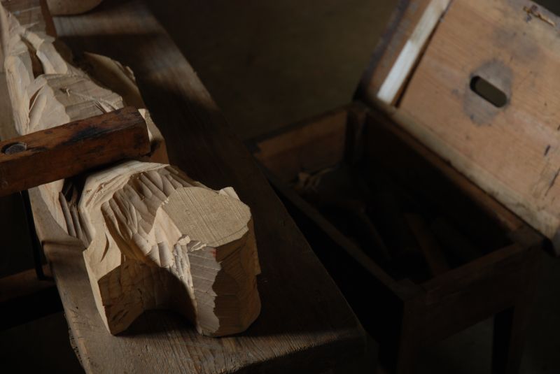 Warsztat pracy rzeźbiarza w chałupie z Jeziorka z XIX wieku. W trakcie rzeźbienia figura Jezusa.