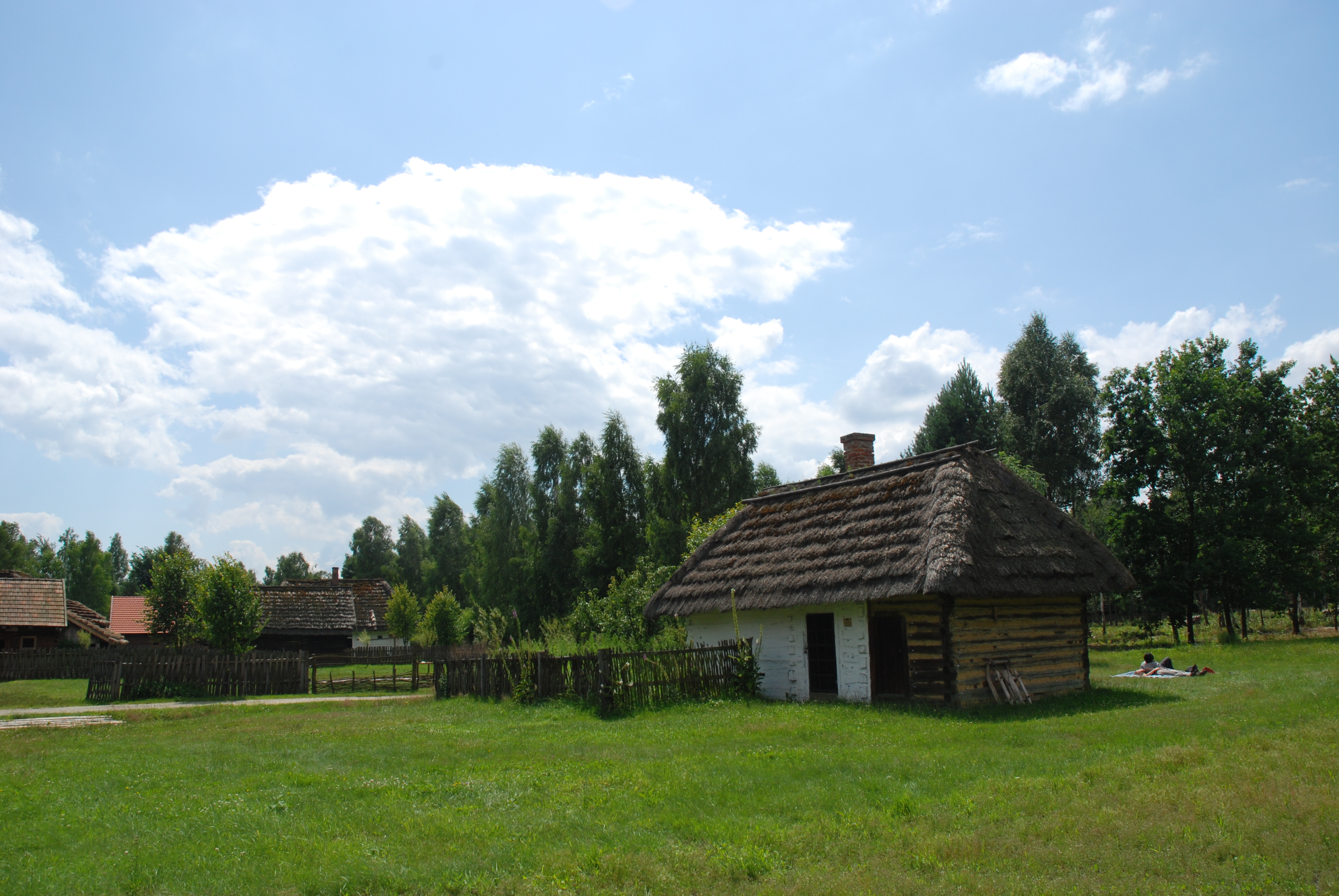 Lasowiacka część muzeum. Chałupa biedniacka ze wsi Lipnica z końca XIX wieku. Należąca do bezrolnych wyrobników wiejskich chałupa stała na gruncie wydzierżawionym od gromady. Ściany o konstrukcji zrębowej z narożami łączonymi na "rybi ogon", z ostatkami. Część mieszkalna bielona. Dach czterospadowy, poszyty słomą, schodkowy. Chałupa wraz z przyległym niewielkim ogródkiem kwiatowym otoczona płotem laskowym plecionym z gałęzi. |