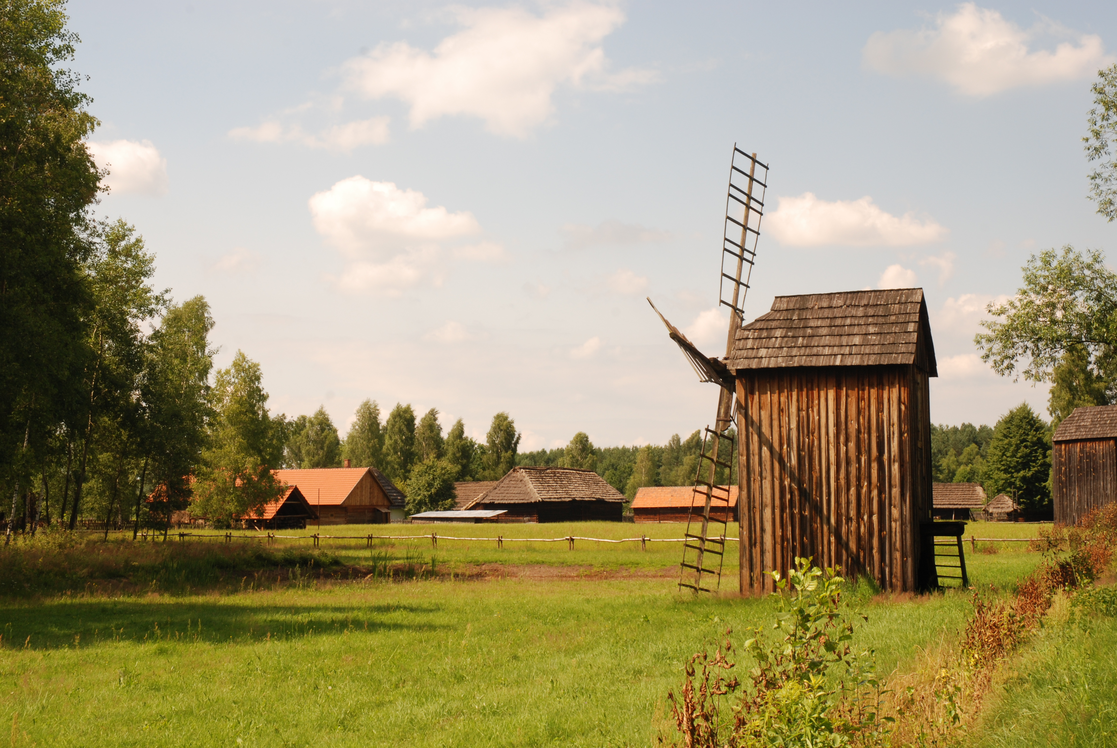 Lasowiacka część muzeum. Wiatrak typu „koźlak” z ok. 1910 roku ze wsi Dąbrówka. w 1919 roku przeniesiony do Hadykówki, a stamtąd w 1933 roku do Trzęsówki. Pracował do 1960 roku. Budynek drewniany, dwukondygnacyjny o konstrukcji słupowo- szkieletowej, oszalowany deskami. Dach dwuspadowy, kryty gontem, z naczółkiem od strony śmig. Wiatrak wyposażony w kompletne urządzenia mielnicze. Korpus wiatraka ze śmigami osadzony na tzw. koźle, drewnianej, statycznej konstrukcji wspartej na głazach narzutowych. Do wiatru obracany przy pomocy dyszli.Za wiatrakiem zagroda złożona z chałupy, stodoły i stajni, pochodzących z dwóch miejscowości z okolic Tarnobrzega: Wrzaw i Cyganów. Budynki zestawione z bali drewnianych, w konstrukcji węgłowej. Dachy chałupy i stodoły czterospadowe, stajni dwuspadowy, poszywane schodkowo słomą . |