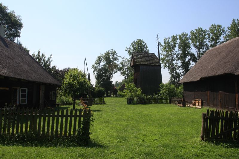 Chałupa ze wsi Kopojno z 1784 roku, stodoła i wiatrak koźlak.