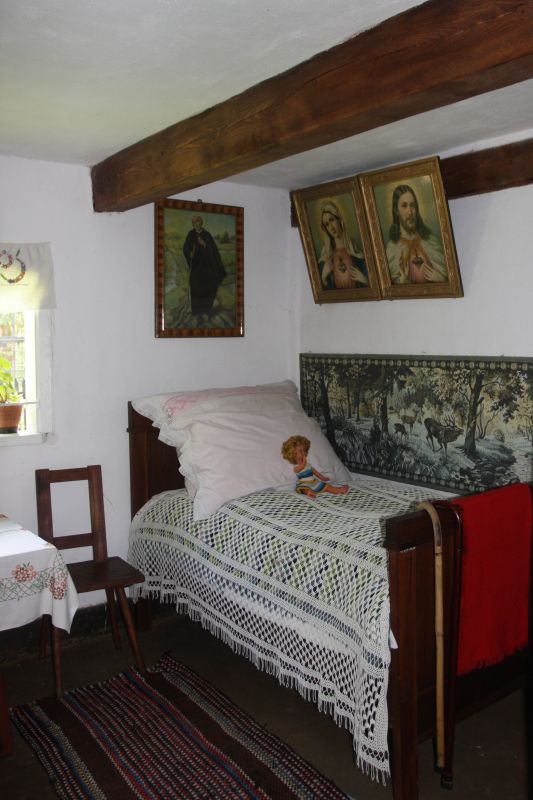 Wnętrze chałupy z 1784 roku ze wsi Kopojno. Izba główna. Na zdjęciu widoczne łóżko, na ścianie za nim makatka i u góry na ścianach oleodruki o tematyce religijnej.