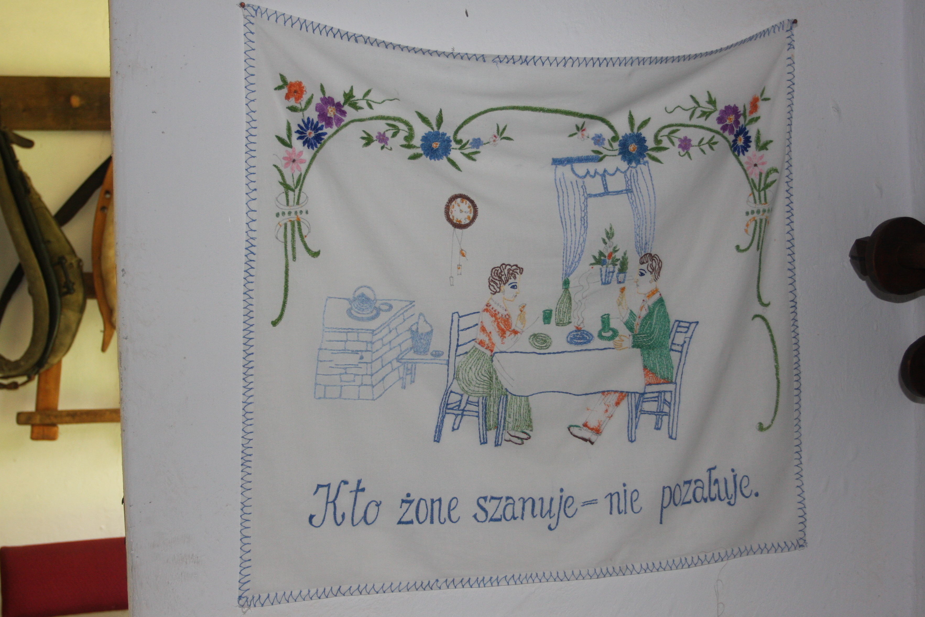 Jedna z haftowanych makatek, zawierających ludowe mądrości w chałupie ze wsi Kopojno.